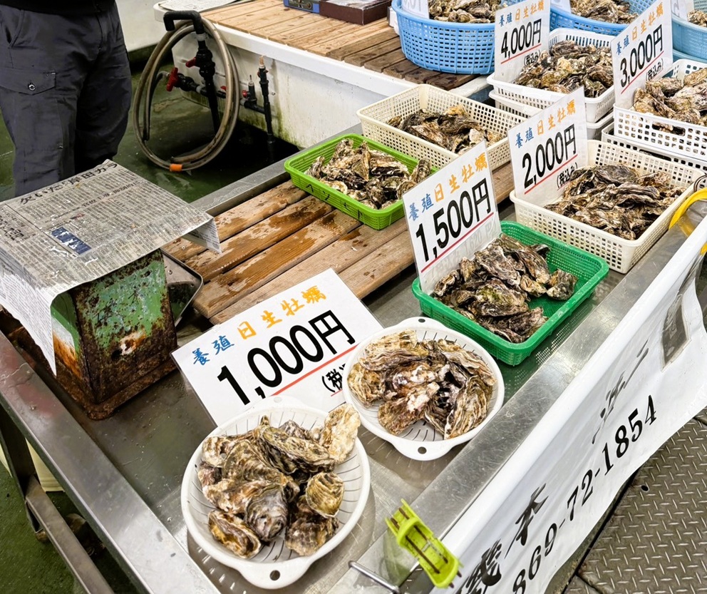 写真は、本日(12/4)に仕入れた生牡蠣と五味の市での殻付き牡蠣販売の様子です。